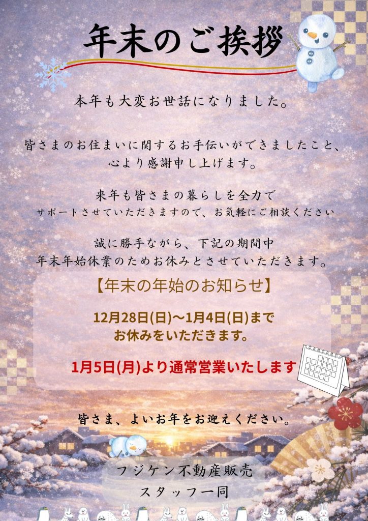平素より当社ホームページをご覧いただき、誠にありがとうございます。年末年始の営業日につきまして、下記のとおりご案内いたします。